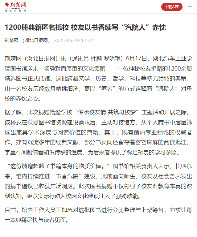 【荆楚网】1200册典籍匿名抵校 校友以书香续写“汽院人”赤忱