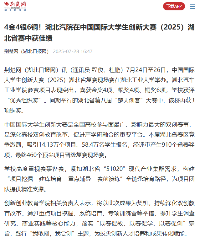 【荆楚网】4金4银6铜!湖北汽院在中国国际大学生创新大赛(2025)湖北省赛中获佳绩-国产精品永久久久久久久久久|91精品无码国产在线观看一区|久久人爽爽人爽爽ąV无码自慰|最新无码国模国产在线|2020最新无码国产在线观看