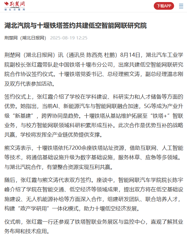 【荆楚网】湖北汽院与十堰铁塔签约共建低空智能网联研究院