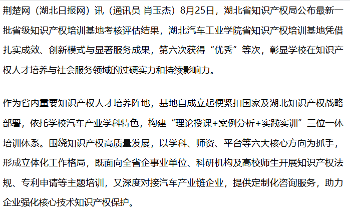 【荆楚网】湖北汽院知识产权培训基地连续六次获评省级考核“优秀”